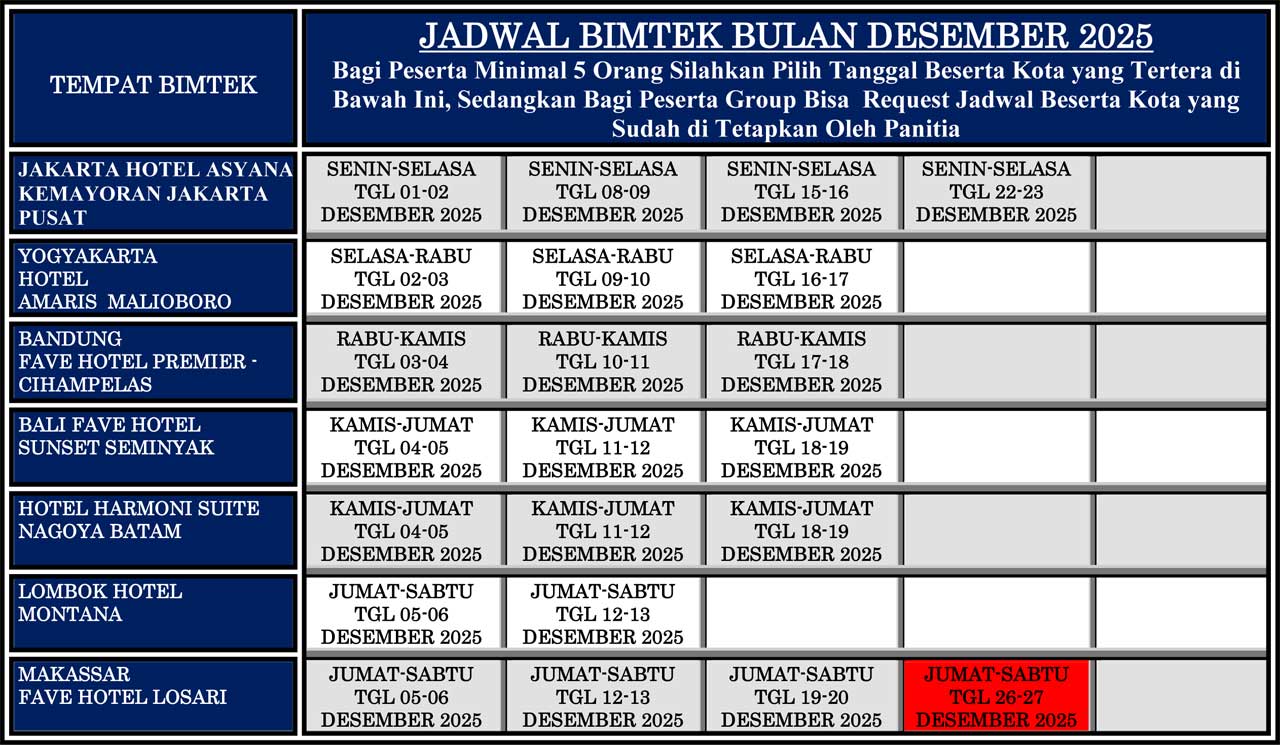 Lokasi dan jadwal pelaksanaan pelatihan dan bimtek diadakan di beberapa kota diantaranya Jakarta, Bali, Bandung, Surabaya, Yogyakarta, Medan, Malang, Semarang, Palembang. Samarinda, Balikpapan, Banjarmasin, Manado, Makassar, Lombok dan beberapa kota lainnya di Indonesia.